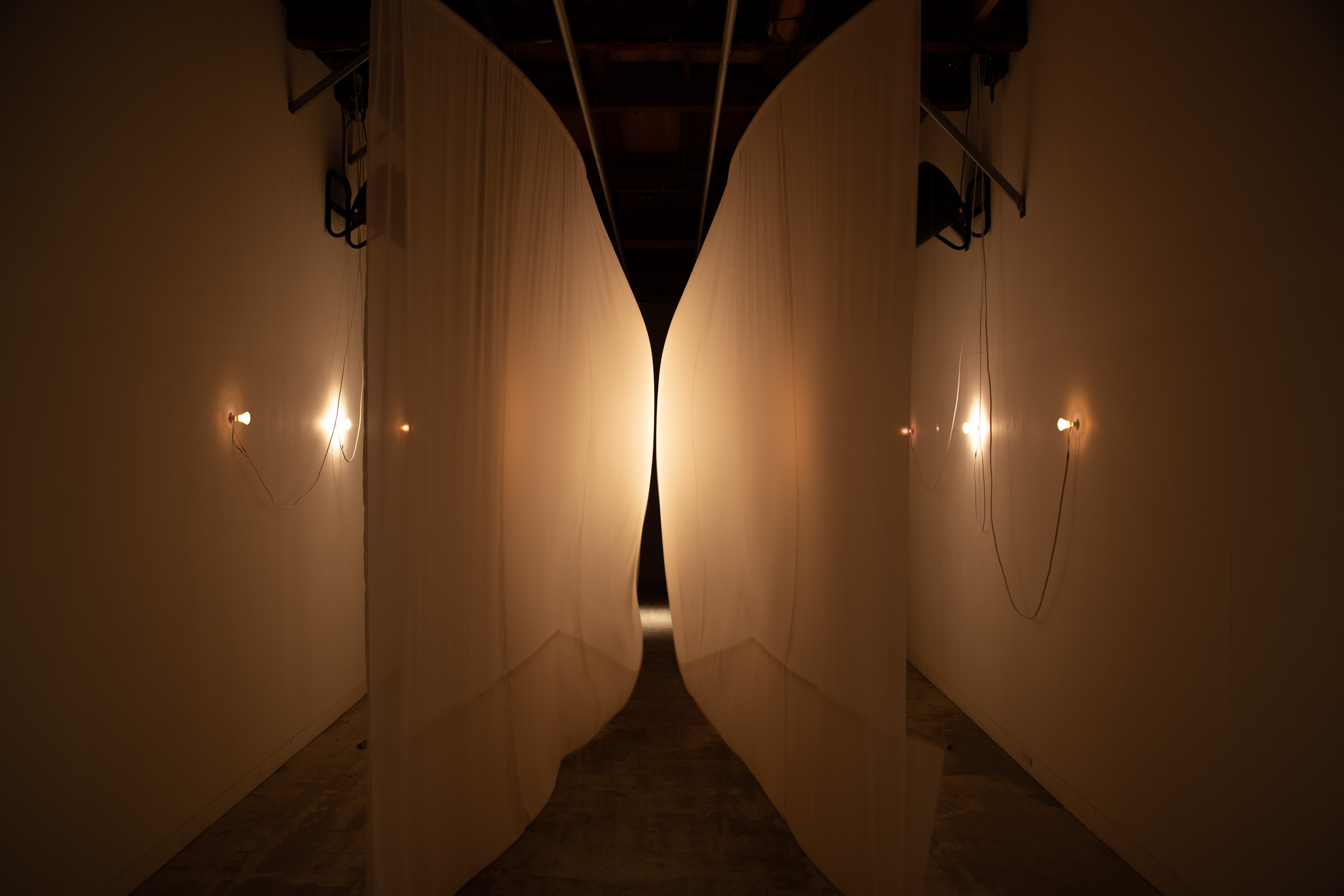 BREATHING IN/EX-TERIOR is an installation of fabrics which uses the venue’s first floor structure. Wind blows from fans positioned strategically in the exhibition, which move interactively with the audience. With the texture and materiality of the fabric, the programming of the fans and lights, this work creates an immersive and soft experience: what the artist calls “intimacy”. At the same time, this work, designed accord- ing to the space of the venue, is synchronized with the sound of the artist breathing. This piece generates intimate breathings that inhale as artist’s body and exhale as public.